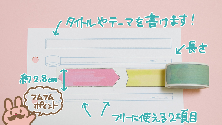 上部にタイトルやテーマを書けるようになっており、マスキングテープは約2,8cmまでの幅のテープを貼ることができます。マスキングテープのデザインの中に項目が3つ書けるようになっていて、2つはフリー項目。もう1つはマスキングテープの長さを記入できるようになっています。できるだけ色々な使い方ができるよう、あえて値段やメーカー名など項目を指定せずフリーにしました。