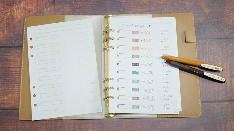 実際に書くとこのようなイメージになります。今回はサラサクリップビンテージカラーでまとめました! 自分の好きな色合いや、よく使う色をメモしておくこともできます。最初はペンが12色・24色・36色と12色刻みのシリーズが多く12本か悩んだのですが、最近5色ずつ展開しているものも多いので10本にしました。