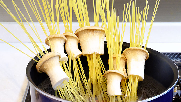 なんじゃこりゃ!! エリンギにパスタを縦にブッ刺すという、見た目のインパクトが絶大の「エリンギパスタ」なるものが話題に!