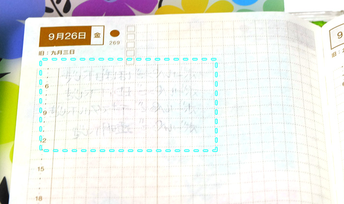 実際に手帳に挟んで、裏のボコボコをチェックしていきます。今回はほぼ日手帳に油性ボールペンでそれぞれの下敷きに入れ替えて書いていきます。